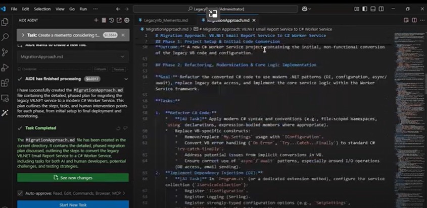 Developers would have typically taken 3-4 weeks to manually rewrite a legacy VB.NET inventory management module, but AiDE Migrate accomplished this modernization in just 4 hours through AiDE® with planning and dependency handled autonomously. The result was not just migrated code but a fully modernized module with preserved business logic and seamless compatibility.